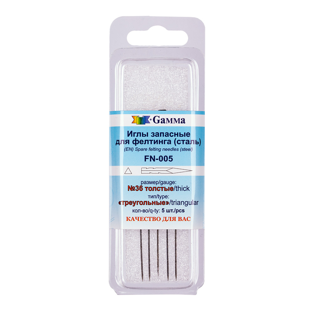 Иглы для валяния "Gamma" FN-005. В наборе 5 сменных игл для фелтинга с треугольным сечением. Сечение рабочей поверхности иглы треугольное. По международной классификации номер иглы показывает ее толщину. Чем выше номер, чем тоньше игла и меньше насечек. Чем толще игла, тем быстрее фильцует, тем больше отверстия, которые она оставляет в изделии. Вы начинаете работу иглой № 36 для создания основной формы изделия. Затем берете тонкую иглу № 40 /финишную/ для дальнейшей проработки изделия, приваливания цветной шерсти, создания фона, отделки деталей.