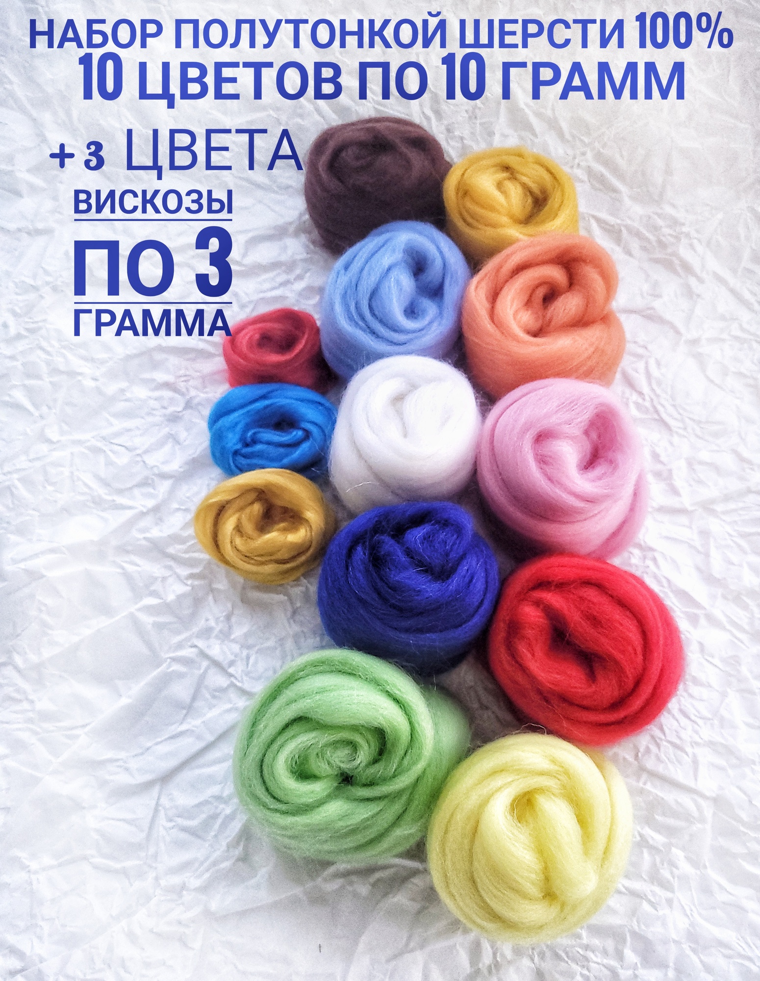 Набор полутонкой шерсти для валяния 10 цветов по 10 грамм, плюс 3 цвета 100% вискозы по 3 грамма.100% полутонкая шерсть, гребенная лента, тонина 26 микрон. Шерсть идеально подходит для мокрого валяния (создание сумок, варежек, обуви, аксессуаров) и сухого валяния (создания игрушек, брошек, декоративных элементов), а также для шерстяной акварели (создание картин из шерсти), фелтинга. Данная шерсть в изделиях хорошо держит форму, войлок получается плотный, ровный. Вискоза придаёт в изделиях блеск и волнистую фактуру. Вес набора шерсти 100 гр +/-5 гр Вес вискозы 9 гр +/-2гр. Набор для валяния можно использовать для детского творчества, так же разноцветный набор шерсти можно подарить и опытным валяльщицам. Полутонкая шерсть для валяния универсальна в применении. Шерсть для валяния поможет создать новое хобби для вас и ваших детей. Сухое валяние набирает популярность среди взрослых людей, а так же среди детей разных возрастов. Разноцветная шерсть для валяния отлично подходит для шерстяной акварели и фелтинга. Набор шерсти для фелтинга это отличный подарок для ребёнка. Полутонкая шерсть для валяния фабрики Камтекс это проверенное временем неизменное качество.