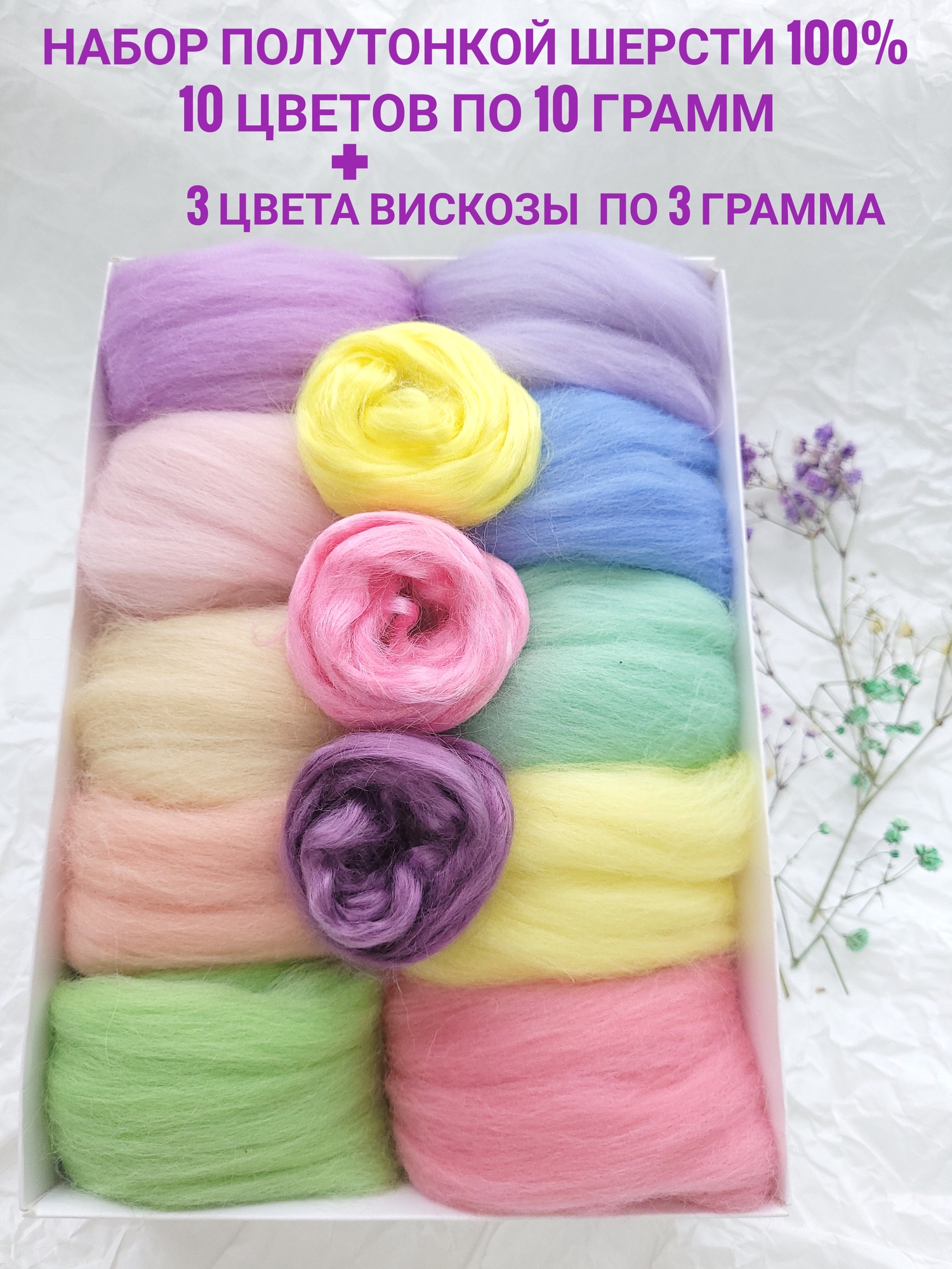 Шерсть для валяния набор 10 цветов по 10 грамм, плюс 3 цвета 100% вискозы по 3 грамма.100% полутонкая шерсть, гребенная лента, тонина 26 микрон. Шерсть идеально подходит для мокрого валяния (создание сумок, варежек, обуви, аксессуаров) и сухого валяния (создания игрушек, брошек, декоративных элементов), а также для шерстяной акварели (создание картин из шерсти), фелтинга. Данная шерсть в изделиях хорошо держит форму, войлок получается плотный, ровный. Вискоза придаёт в изделиях блеск и волнистую фактуру. Вес набора шерсти 100 гр +/-5 гр Вес вискозы 9 гр +/-2гр. Набор для валяния можно использовать для детского творчества, так же разноцветный набор шерсти можно подарить и опытным валяльщицам. Полутонкая шерсть для валяния универсальна в применении. Шерсть для валяния поможет создать новое хобби для вас и ваших детей. Сухое валяние набирает популярность среди взрослых людей, а так же среди детей разных возрастов. Разноцветная шерсть для валяния отлично подходит для шерстяной акварели и фелтинга. Набор шерсти для фелтинга это отличный подарок для ребёнка. Полутонкая шерсть для валяния фабрики Камтекс это проверенное временем неизменное качество.