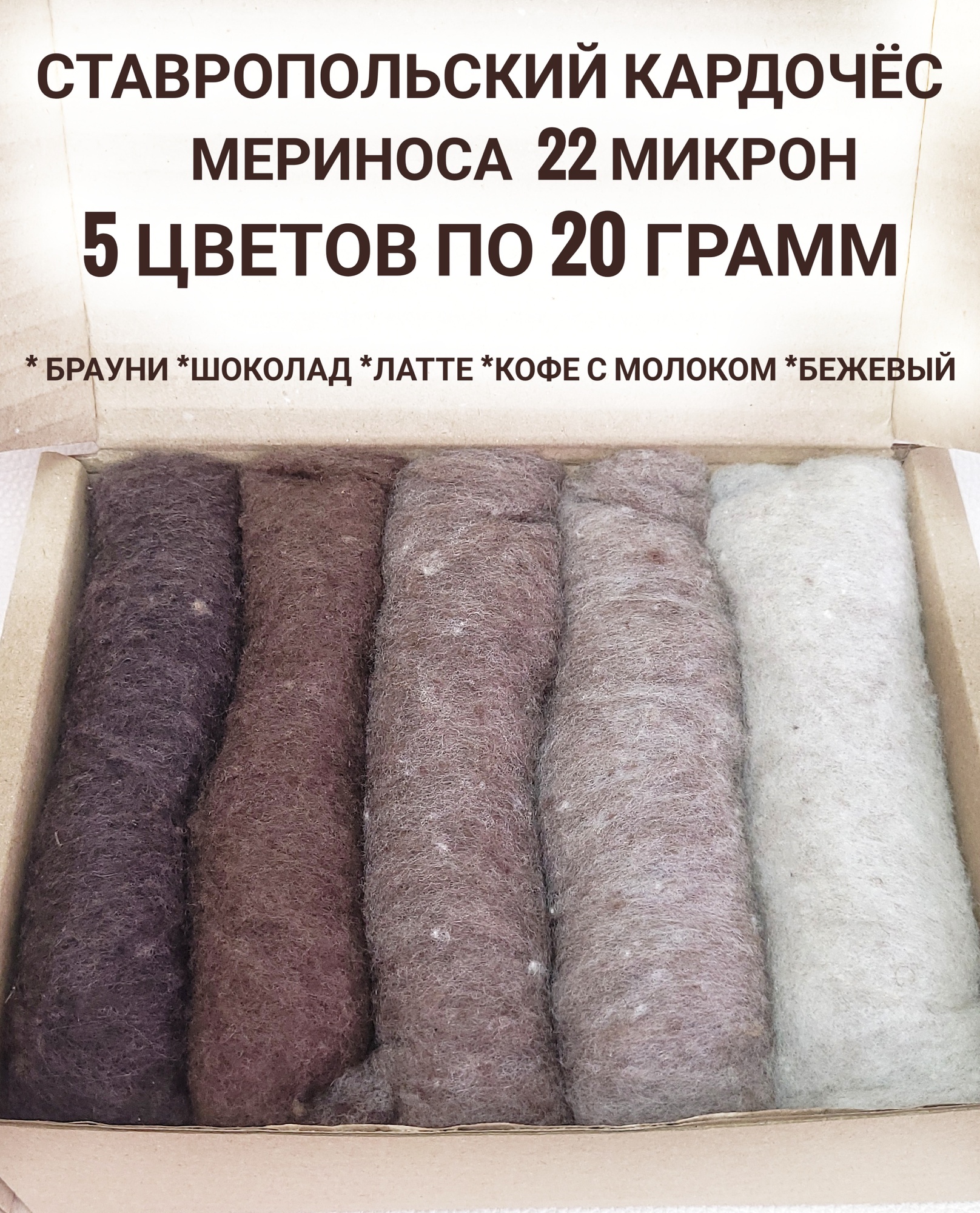 Набор шерсти для валяния. Кардочёс 5 цветов по 20 грамм. 100% шерсть, породы овец Ставропольский меринос. Данная порода овец славится высококачественной шерстью с ровной толщиной шерсти по всей длине. По качеству шерсти данная порода полностью идентична с породой Австралийский меринос. Данная шерсть представлена в виде кардочеса в полотне (шерстяная вата), волокна в кардочесе расположены в разных направлениях, что ускоряет и упрощает процесс валяния. Набор для валяния содержит пять цветов шерсти, толщина волокна (тонина) 22 микрон.Кардочес идеально подходит для мокрого валяния (создание сумок, варежек, обуви, аксессуаров) и сухого валяния (создания игрушек, брошек, декоративных элементов), а также для шерстяной акварели (создание картин из шерсти), фелтинга. Изделия будут мягкими, нежными, гипоаллергенными и не будут колоться.Набор из 5 цветов по 20 гр.Вес набора 100 гр +/-5 гр.