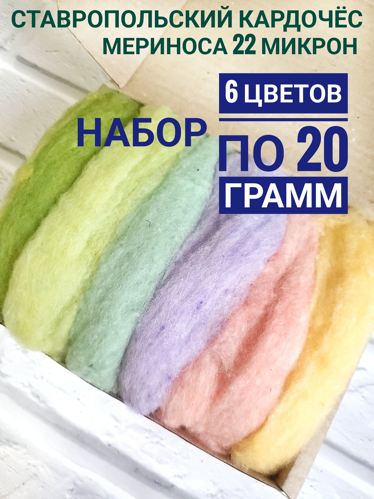 Шерсть для валяния кардочес. 6 цветов по 20 грамм. 100% шерсть, породы овец Ставропольский меринос. Данная порода овец славится высококачественной шерстью с ровной толщиной шерсти по всей длине. По качеству шерсти данная порода полностью идентична с породой Австралийский меринос. Данная шерсть представлена в виде кардочеса в ленте (топс), волокна в кардочесе расположены в разных направлениях, что ускоряет и упрощает процесс валяния. Набор для валяния содержит шесть цветов шерсти, толщина волокна (тонина) 22 микрон.Кардочес идеально подходит для мокрого валяния (создание сумок, варежек, обуви, аксессуаров) и сухого валяния (создания игрушек, брошек, декоративных элементов), а также для шерстяной акварели (создание картин из шерсти), фелтинга. Изделия будут мягкими, нежными, гипоаллергенными и не будут колоться.Набор из 6 цветов по 20 гр.Вес набора 120 гр +/-5 гр