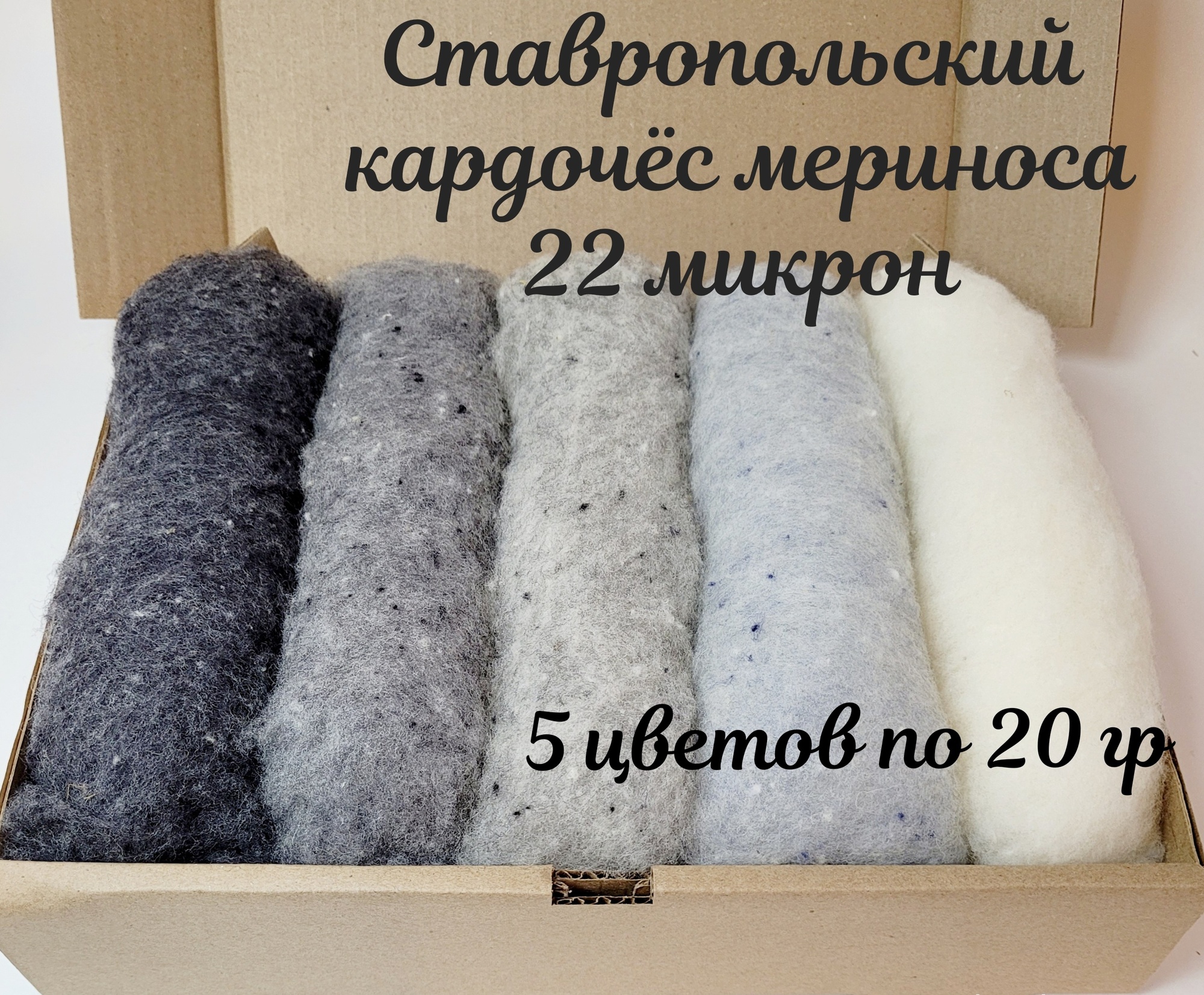 Набор тонкой мериносовой шерсти для валяния. 5 цветов по 20 грамм. 100% шерсть, породы овец Ставропольский меринос. Данная порода овец славится высококачественной шерстью с ровной толщиной шерсти по всей длине. По качеству шерсти данная порода полностью идентична с породой Австралийский меринос. Данная шерсть представлена в виде кардочеса в полотне, волокна в кардочесе расположены в разных направлениях, что ускоряет и упрощает процесс валяния. Набор для валяния содержит пять цветов шерсти, толщина волокна (тонина) 20 - 22 микрон.Шерсть идеально подходит для мокрого валяния (создание сумок, варежек, обуви, аксессуаров) и сухого валяния (создания игрушек, брошек, декоративных элементов), а также для шерстяной акварели (создание картин из шерсти), фелтинга. Изделия будут мягкими, нежными, гипоаллергенными и не будут колоться. Игрушки из данного кардочеса получаются более натуральными. Набор из 5 цветов по 20 гр.Вес набора 100 гр +/-5 гр. тэги для поиска: шерсть для валяния, кардочес, кардачес, шерсть кардочес, шерсть для фелтинга, шерсть для мокрого валяния, шерсть тонкая Набор для валяния можно использовать для детского творчества, так же разноцветный набор шерсти можно подарить и опытным валяльщицам. Тонкая шерсть для валяния универсальна в применении. Шерсть для валяния поможет создать новое хобби для вас и ваших детей. Сухое валяние набирает популярность среди взрослых людей, а так же среди детей разных возрастов. Разноцветная шерсть для валяния отлично подходит для шерстяной акварели и фелтинга. Набор шерсти для фелтинга это отличный подарок для ребёнка.