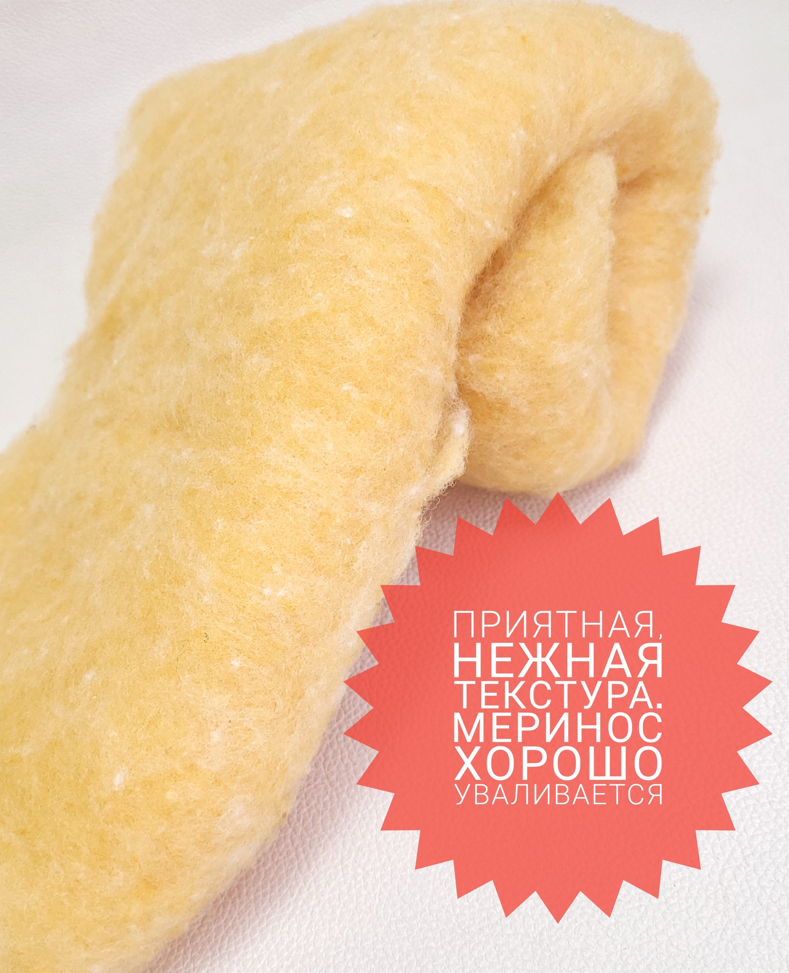 Шерсть для валяния кардочес, породы овец Ставропольский меринос. Данная порода овец славится высококачественной шерстью с ровной толщиной шерсти по всей длине. По качеству шерсти данная порода полностью идентична с породой Австралийский меринос. Данная шерсть представлена в виде кардочеса в полотне (шерстяная вата), волокна в кардочесе расположены в разных направлениях, что ускоряет и упрощает процесс валяния. Тонина (толщина волокна) 20-22 микрон. Кардочес идеально подходит для мокрого валяния (создание сумок, варежек, обуви, аксессуаров) и сухого валяния (создания игрушек, брошек, декоративных элементов), а также для шерстяной акварели (создание картин из шерсти), фелтинга. Изделия будут мягкими, нежными, гипоаллергенными и не будут колоться. Вес 50 гр +/-3 гр.