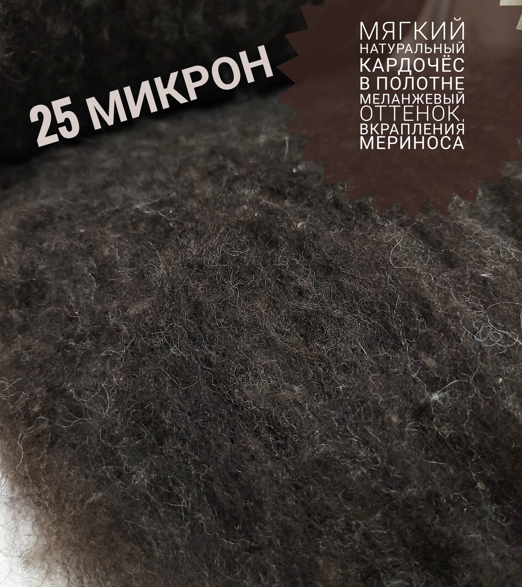 Кардочес для валяния неокрашенный натуральный, породы овец Ставропольский меринос. Данная порода овец славится высококачественной шерстью с ровной толщиной шерсти по всей длине. По качеству шерсти данная порода полностью идентична с породой Австралийский меринос. Данная шерсть представлена в виде кардочеса в полотне (шерстяная вата), волокна в кардочесе расположены в разных направлениях, что ускоряет и упрощает процесс валяния. Тонина (толщина волокна) 25 микрон. Кардочес идеально подходит для мокрого валяния (создание сумок, варежек, обуви, аксессуаров) и сухого валяния (создания игрушек, брошек, декоративных элементов), а также для шерстяной акварели (создание картин из шерсти), фелтинга. Вес 200 гр +/-5 гр.